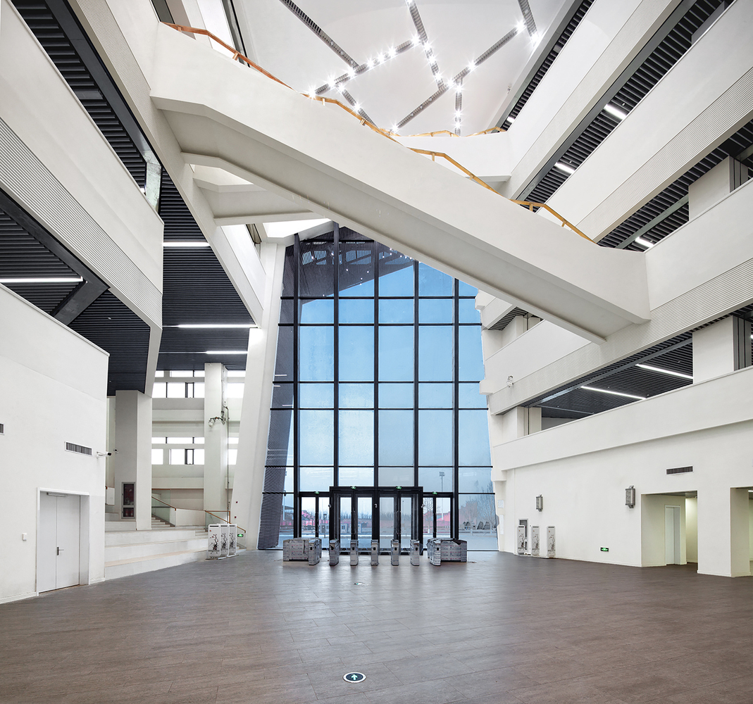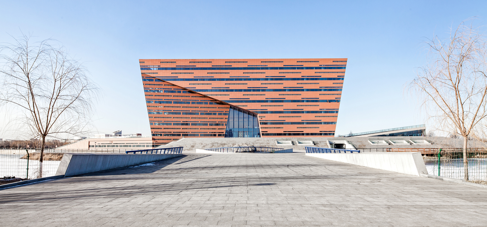 河北工业大学历史悠久,北洋时期已有“洋为中用、古为今用”的学术理念,并有工学并举的悠久传统。河北工业大学北辰校区于2004年开始建设,占地面积164.5公顷,是国家重点建设工程,建成后将作为主校区使用。本图书馆项目位于河北工业大学北辰校区中心地块,基地面积约28270平方米,新建图书馆总建筑面积44974平方米,建筑高度约40米。本项目于2013年展开设计竞赛,同济大学建筑设计院以“书山墨海”为主题的方案从众多竞争对手中脱颖而出,此后经历多次优化和深化设计。项目于2014年开工,2017年工程竣工并投入使用。